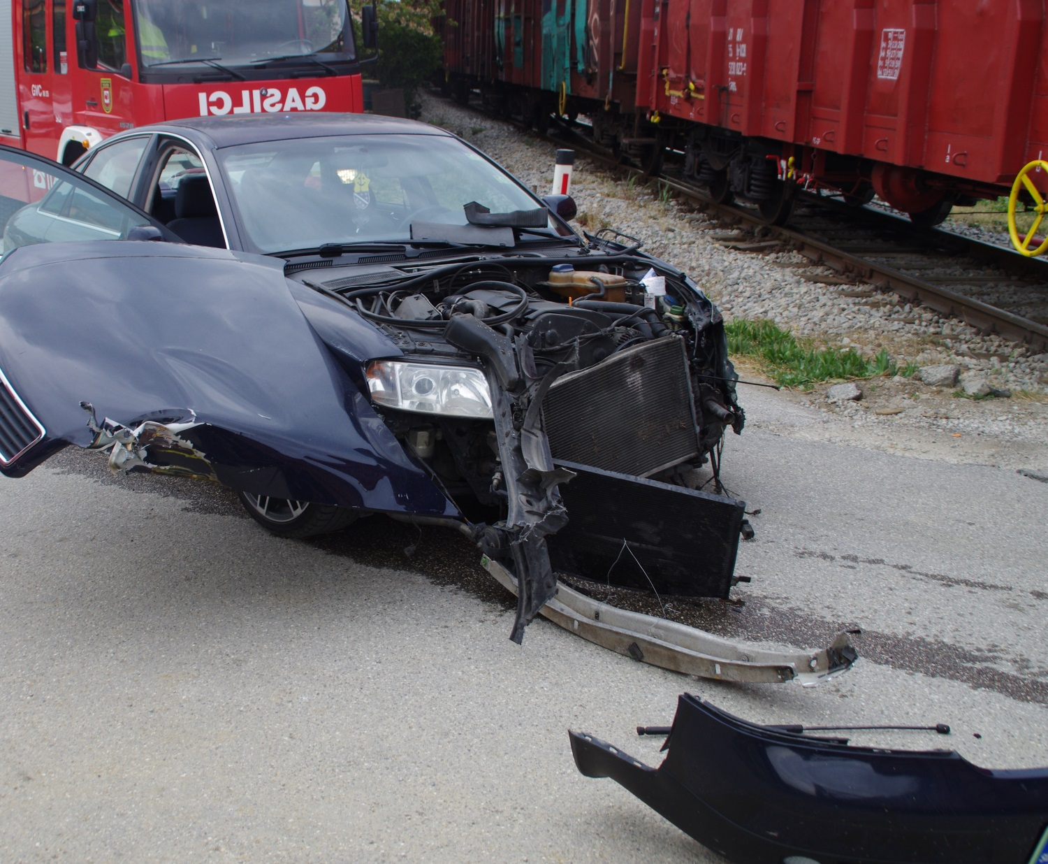 V Prvačini tovorni vlak na nezavarovanem prehodu ceste čez železniško progo...
