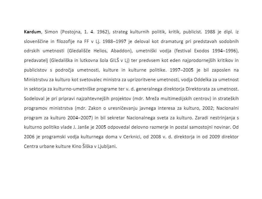 Spomnimo, da je Kardum bizaren lik in človek Zorana Jankovića, ki je s polhovko na glavi vodil center Kino Šiška. Svoj življenjepis delovnih izkušenj je napisal kar na četrtini strani A4-formata.