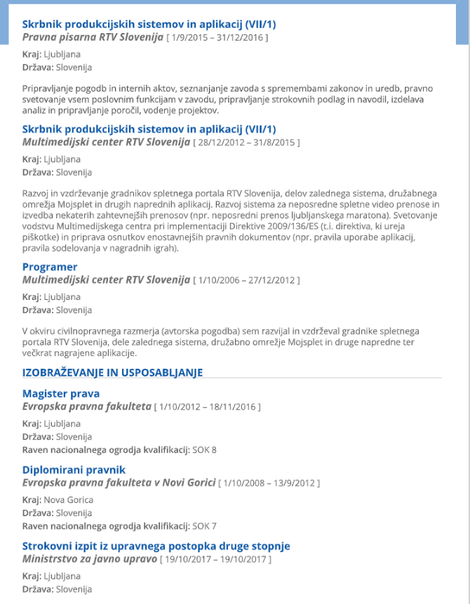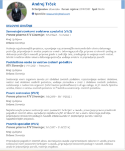 Tudi Trček ravno ne ustreza têrminu “pravni strokovnjak”, saj nikoli ni delal v pravosodju in nima pravniškega državnega izpita. Njegov življenjepis pravi, da je deloval predvsem znotraj pravne pisarne RTV in je bil zadolžen za varstvo osebnih podatkov.