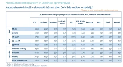 Med podporniki Demokratov prevladujejo moški, tisti, ki so v srednji starostni skupini (35–54 let), in tisti, ki imajo najvišjo izobrazbo. Ženske prevladujejo med podporniki Levice in Vesne. Med njihovimi podporniki je največ tistih, ki so del najmlajše starostne skupine (18–34 let) in imajo najvišjo doseženo izobrazbo. Moški prevladujejo med podporniki SD kot tudi skupne liste NSi, SLS in Fokus. Medtem ko največ podpornikov SD prihaja iz najmlajše starostne skupine, največ podpornikov skupne liste izhaja iz najstarejše starostne skupine. Tisti s poklicno izobrazbo prevladujejo med podporniki SD, tisti z najnižjo izobrazbo pa pri skupni listi.