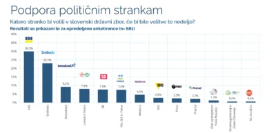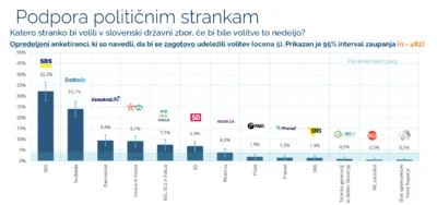 V kolikor upoštevamo vse anketirance, bi SDS uživala 22,5-odstotno podporo, Svoboda pa 17,3-odstotno podporo. Sledili bi Demokrati s 7-odstotno podporo in združena lista Levice in Vesne s 6-odstotno podporo. Nad parlamentarni prag bi se uspelo uvrstiti še stranki SD (5,7 odstotka) in skupni listi strank NSi, SLS in Fokus (5,6 odstotka).
