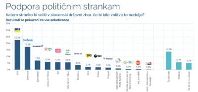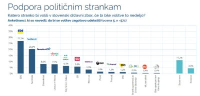 Med tistimi, ki se bodo volitev zagotovo udeležili, bi jih največ (27,2 odstotka) podprlo SDS, sledijo Svoboda (20,3 odstotka), Demokrati (8 odstotkov), lista Levice in Vesne (7,7 odstotka), lista NSi, SLS in Fokus (6,3 odstotka) ter SD (5,8 odstotka).