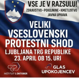 V sredo, 23. aprila, pa bo na ljubljanskem Trgu republike ob 15h protestni shod nezadovoljnih državljank in državljanov, ki ga organizira Glas upokojencev. Vabljeni so pripadniki vseh generacij. Predsednik omenjene organizacije Pavel Rupar napoveduje odziv tako na dogajanje v pravosodju kot tudi glede referenduma.