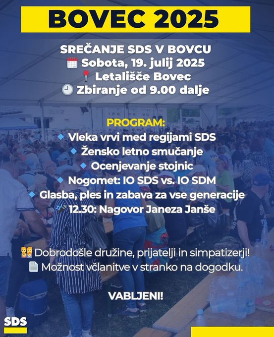 SDS tradicionalno poletno srečanje na Bovškem letos prireja že tridesetič, začelo pa se je z osrednjo prireditvijo na bovškem letališču in srečanjem občinskih in mestnih odborov ter več tisoč članov in simpatizerjev iz vse Slovenije. Poleg športnih iger, nogometa, glasbe, druženja in regijske kulinarične ponudbe je današnji program obsegal tudi nagovore visokih predstavnikov stranke.