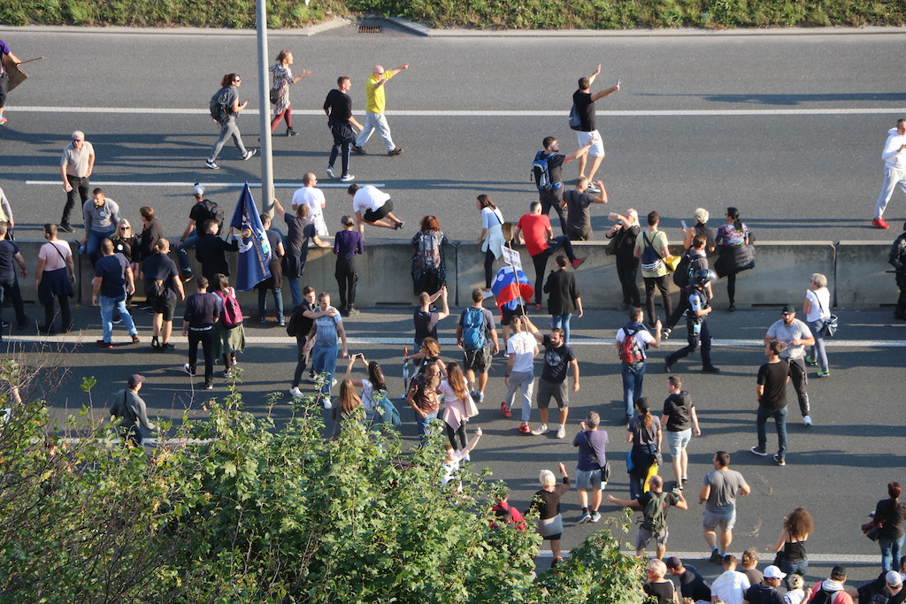 Protest se je sicer začel že ob 13. uri. Po treh urah na Trgu republike so proticepilci krenili pred predsedniško palačo. Od tam po Celovški cesti proti obvoznici, kjer so ustavili promet in skakali pred avtomobile.