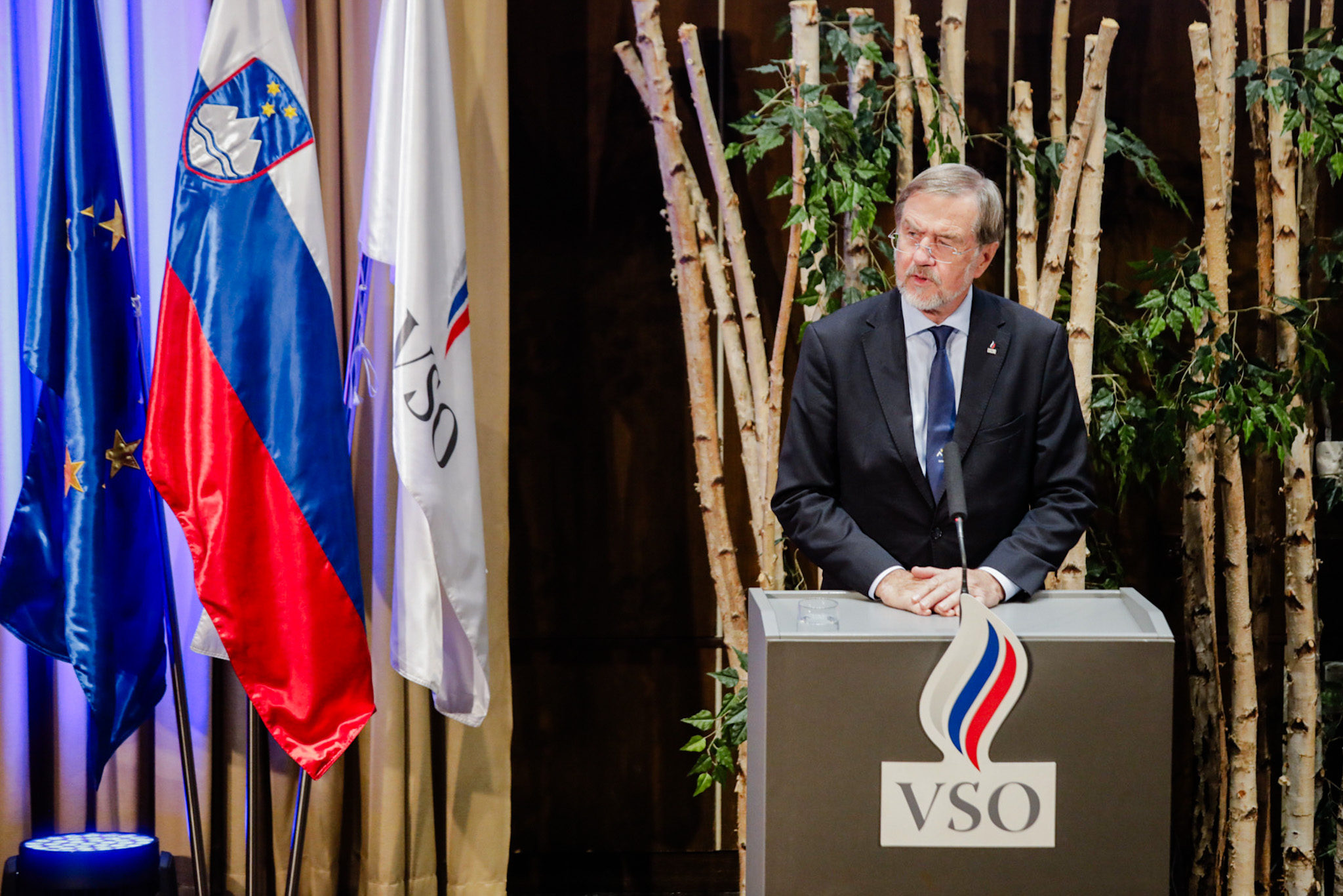 “Gospe in gospodje, veteranke in veterani, spoštovane članice in člani združenja za vrednote slovenske osamosvojitve, Mark Mazower v svoji odlični knjigi The Dark Continent pravi, da ljudje zelo radi “berejo sedanjost nazaj v preteklost” in zato mnogi mislijo, da je demokracija nekako naravno zakoreninjena globoko v evropska tla.