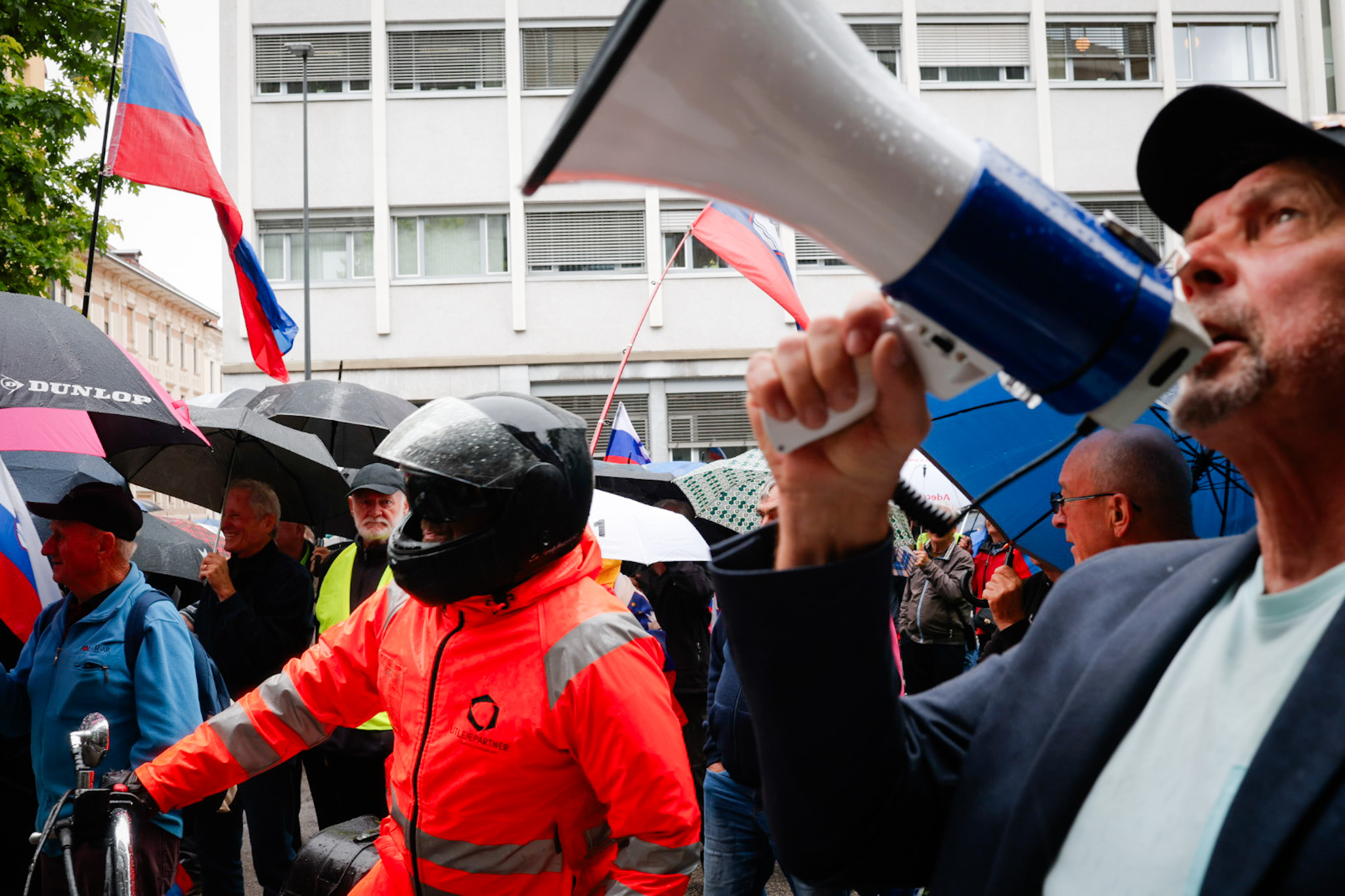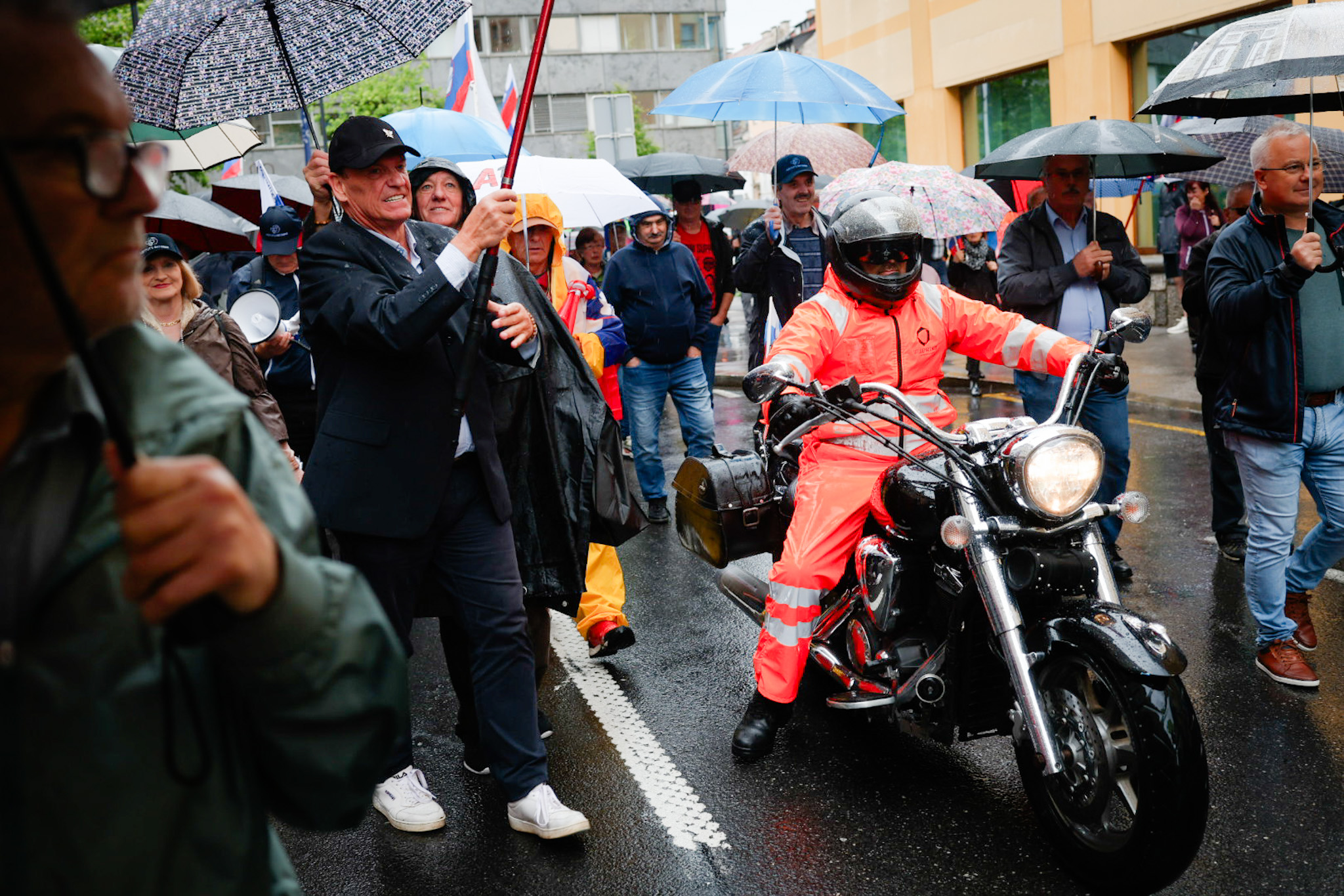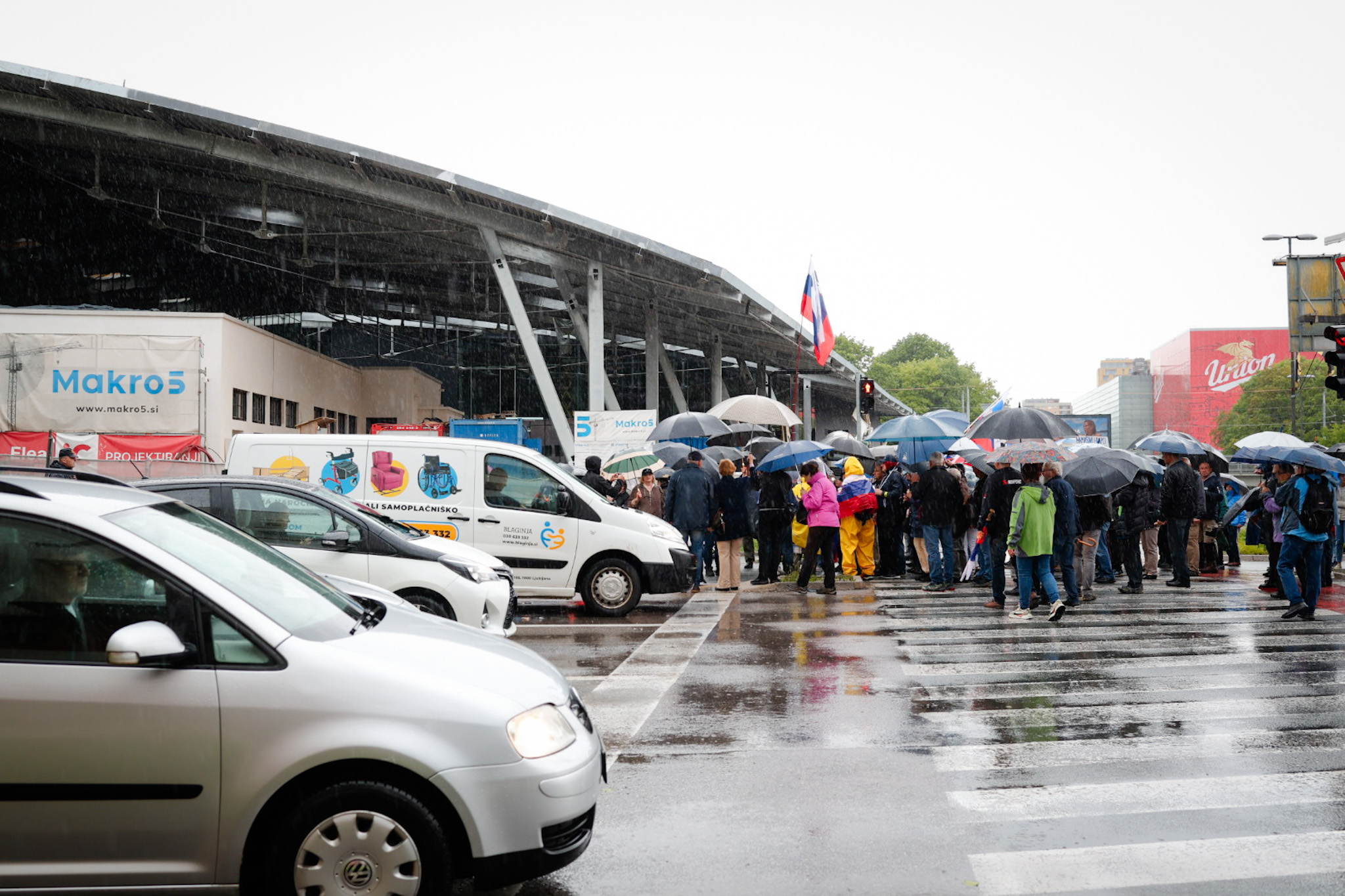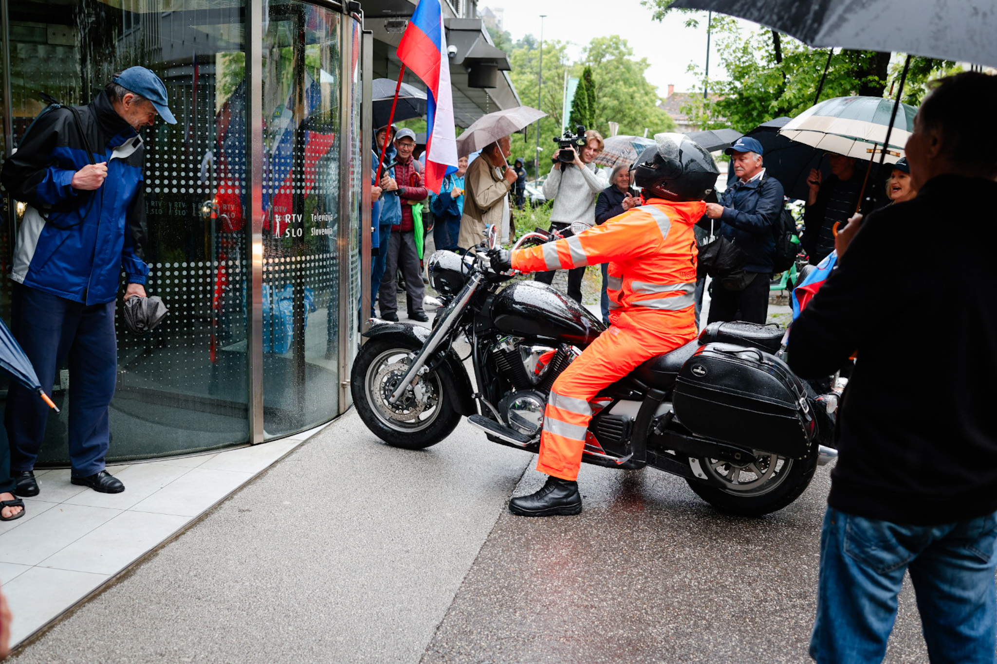 Protestniki so se še pred uradnim delom na Trgu republike tudi tokrat ustavili pred Radiotelevizijo Slovenija, kjer jih je nekaj, med njimi predsednik Inštituta 1. oktober Pavel Rupar, celo vstopilo v avlo radijske hiše.