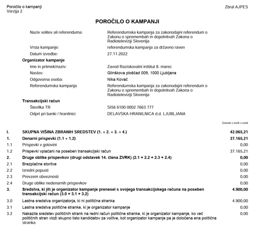 Njihovo poročilo po referendumu o čistki na RTV Slovenija pa kaže, da so kampanjo plačali iz rednega računa v višini 4.900 evrov, ki se napaja s prispevki iz tujine in to tudi od pravnih oseb. Oboje je za kampanje prepovedano. Računsko sodišče referendumskih kampanj ne preverja. Nobenega nadzora ni, razen medijskega. Ki pa ga pri 8. marcu, ki ga večina medijev reklamira, tudi ni.