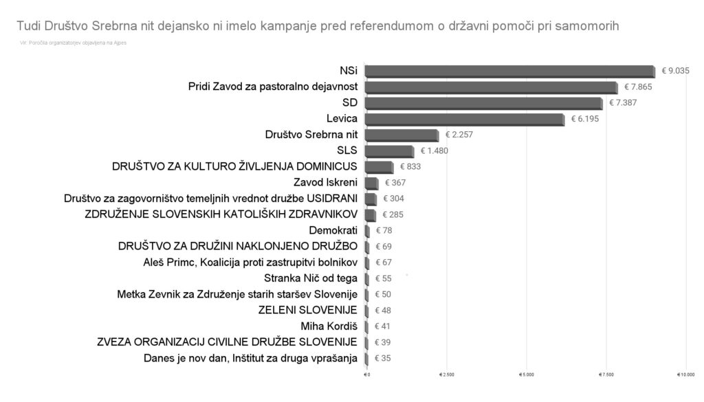 Največji stranki Svoboda in SDS po zadnjem referendumu še nista poročali. Strankam so nakazila iz tujine in vseh pravnih oseb prepovedana, financiranje kampanj iz tujine in od pravnih oseb zakon tudi prepoveduje (izjema so evropske volitve), a zasebni zavod 8. marec, za direktorico je Niko Kovač ob ustanovitvi postavil Maljevac, je na ta prepovedan način ves čas financiran in iz tako “polnjenega” rednega računa plačuje stroške kampanje, v kampanji za vladne stranke je na družabnih omrežjih tudi že pred za marec razpisanimi volitvami poslancev. Proračun ima ta Zavod, ki se razglaša za inštitut, da bi zvenelo bolj učeno, večji kot večina strank, ki bo nastopila na volitvah poslancev. Leta 2024 so imeli v 8. marcu 718.989 evrov prihodkov iz neznanih virov. Brez vsakega stroška za delo. Prikaz doslej prijavljenih kampanj pred referendumom o državnih samomorih je takšen.