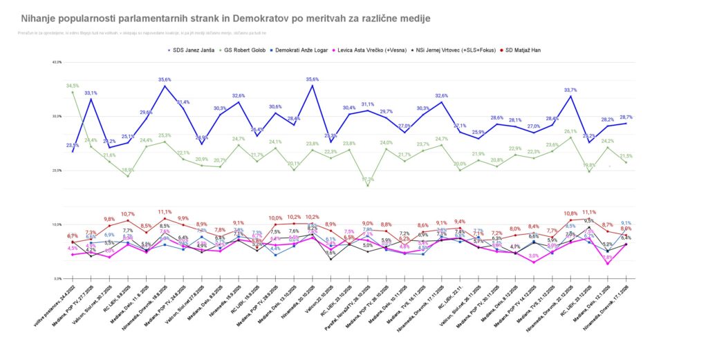 V Ninamedii za Dnevnik so popravili način merjenja in anketiranim zdaj ponujajo v izbiro stranke, ki bodo verjetno na volitvah. Doslej so merili precej mimo. Napaka imajo še pri koalicijah, kjer skupaj merijo Levico in Vesno, ne pa tudi NSi, SLS in Fokusa, kjer so podobno že pred časom napovedali skupen nastop. V DZ bi se po meritvi Ninamedie uvrstili še Svoboda s 21,5 odstotka, SD Matjaža Hana s 8,0, Levica v koaliciji z Vesno s 6,4 in Resni.ca Zorana Stevanovića s 4.1. Tri desno sredinske stranke bi zbrale 44,2 odstotka glasov, štiri levo sredinske pa točno 40 odstotkov. Če bi pravilneje merili še koalicijo NSi, bi bil razkorak verjetno še večji. Izven parlament bi s 3,4 ostal Prerod Vladimirja Prebiliča, SNS Zmage Jelinčiča s 2,3, Pirati Jasmina Feratovića z dvema odstotkoma, Mi, Socialisti Mihe Kordiše z 1,7, SLS Tine Bregant z 1,3…