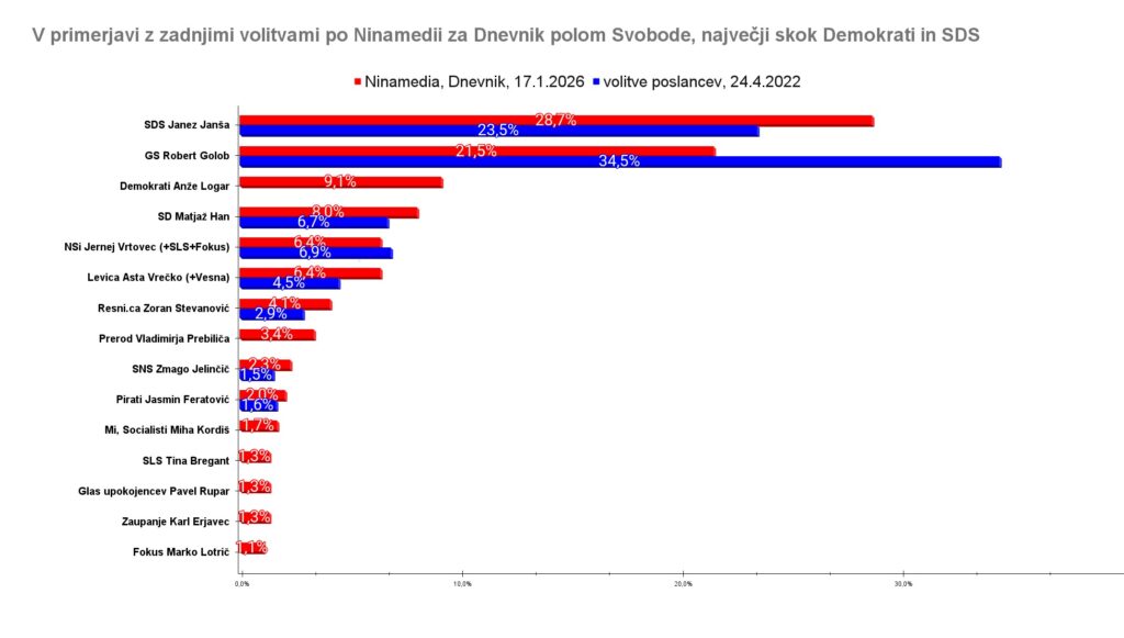 Janez Janša bi gladko dobil volitve, ker so volivci Svobode Roberta Goloba zbežali k SDS in Demokratom. To kaže danes objavljena raziskava Ninamedie za Dnevnik, po kateri bi Janša s povezavo SDS, ki bi jo volilo 28,6 odstotka volivcev, z Demokrati Anžeta Logarja, ki bi bili tretja najmočnejša stranka z 9,1 odstotkom in z NSi Jerneja Vrtovca s 6,4 odstotki, ob relativni zmagi dobil tudi večino v DZ.
