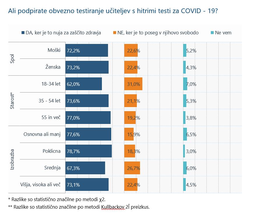 Sodeč po rezultatih ankete so ženske tiste, ki v večji meri podpirajo testiranje učiteljev, ker je to nujno za zaščito zdravja. Najbolj so testiranju naklonjene ženske v starostni skupini 55 let in več, najmanj pa tiste, ki so v starostni skupini 18-34 let. Sodeč po izobrazbi so testiranju najbolj naklonjene tiste, ki imajo poklicno izobrazbo, najmanj pa tiste, ki imajo srednješolsko izobrazbo.