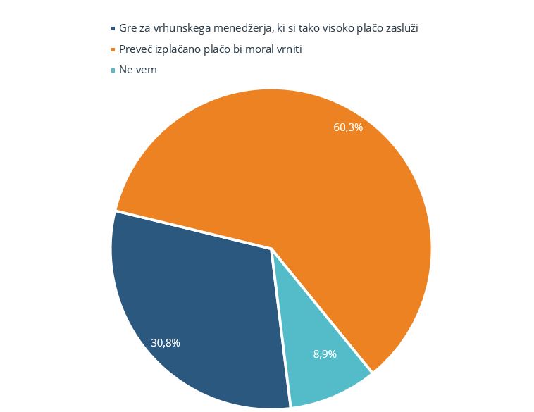 Večina (60,3 odstotka anketirancev) je mnenja, da bi moral Robert Golob vrniti preveč izplačano plačo. Le slaba tretjina (30,8 odstotka vprašanih) je mnenja, da si je takšno plačo zaslužil. 8,9 odstotka je takšnih, ki o celotni zadevi nimajo mnenja.