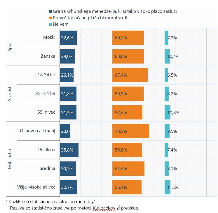 Če si pogledamo križanje med demografskimi in vsebinsko spremenljivko, lahko vidimo, da med tistimi, ki menijo, da gre v primeru Goloba za vrhunskega menedžerja, ki si visoko plačo več kot zasluži, prevladujejo moški. Najbolj naklonjena mu je starostna skupina od 35 do 54 let in tisti s poklicno izobrazbo. Med tistimi, ki menijo, da bi moral Golob preveč izplačano plačo vrniti, prevladujejo ženske, tisti v starostni skupini 18–34 let in tisti z osnovno izobrazbo ali manj.