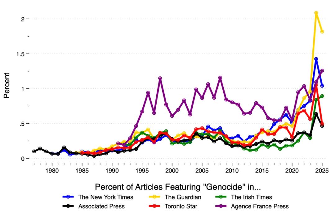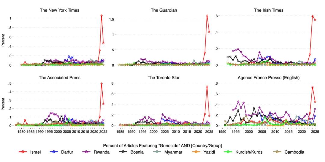 Rezultati so bili presenetljivi in nedvoumni: poročanje, ki povezuje Izrael z genocidom, je močno preseglo vsako drugo splošno priznano zgodovinsko zadevo v vseh preučenih medijih. Na primer, v The New York Times so članki, ki povezujejo Izrael in genocid, dosegli več kot devetkrat višjo raven kot pri Ruandi in skoraj šestkrat večjo kot pri Darfurju. Podobno tudi v The Guardian, kjer več kot 1 % vseh člankov zdaj omenja tako Izrael kot genocid – pogostost, ki ji v zadnjih desetletjih ni para.
