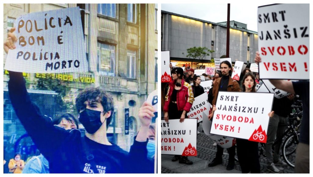 V Sloveniji lahko iz tedna v teden opazujemo, kako se na petkovih shodih pojavlja organizirana grožnja s smrtjo ob podpori opozicijskih strank in levici podrejenih osrednjih medijev. Če bi človek pričakoval, da bo tožilstvo zaradi napisov “smrt janšizmu” odreagiralo, se je uštel. To je namreč zavrglo kazensko ovadbo in pripomnilo, da pri grožnjah s smrtjo naj ne bi šlo za spodbujanje sovraštva, nestrpnosti in nasilja?! Kakšna banana republika smo pa najbolje dokazuje novica iz Portugalske, kjer so enega izmed protestnikov, ki je nosil transparent z napisom “Dober policaj je mrtev policaj” ovadili. Grozi mu petletna zaporna kazen.