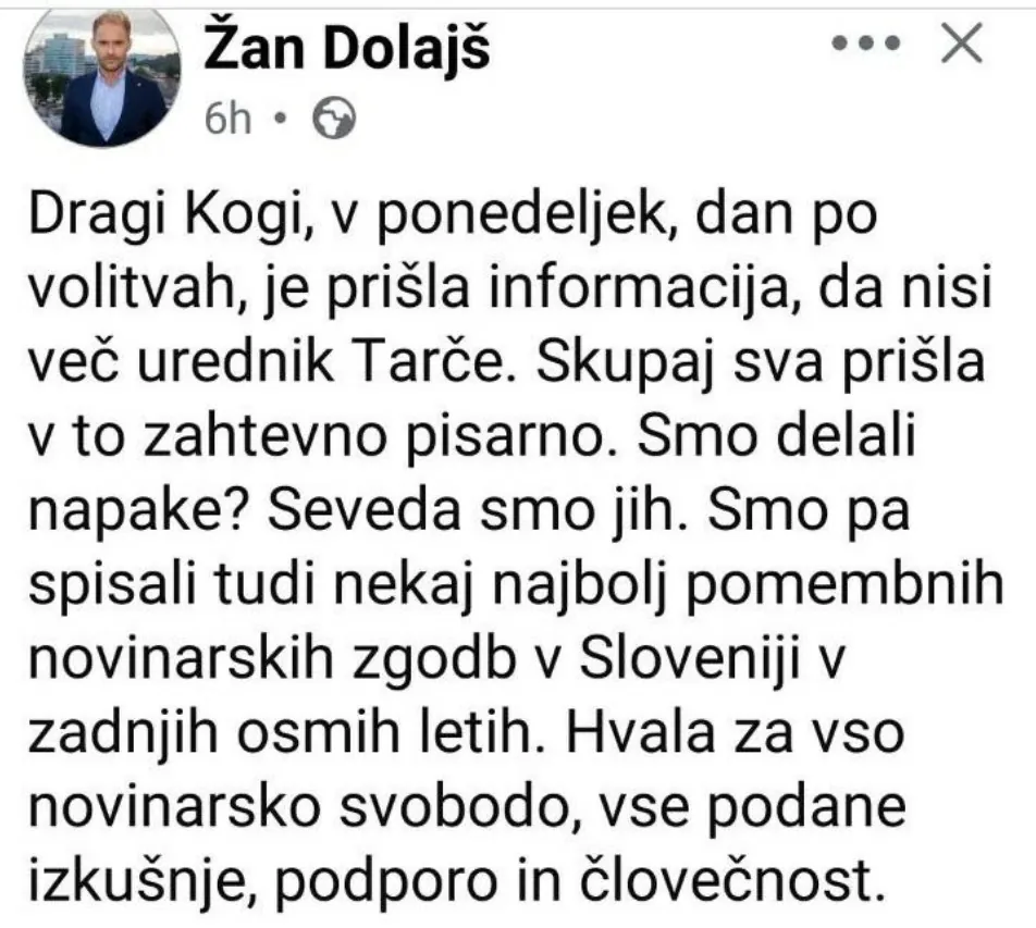 Na družbenih omrežjih je zaokrožila informacija, da je takoj naslednji dan po nedeljskih parlamentarnih volitvah vodstvo depolitizirane RTV razrešilo urednika oddaje Tarča na RTV Slovenija Boštjana Kogovška in na njegovo mesto postavilo Eriko Žnidaršič. Na vodstvo RTV smo naslovili vprašanje, zakaj javnost o tem ni bila uradno obveščena.