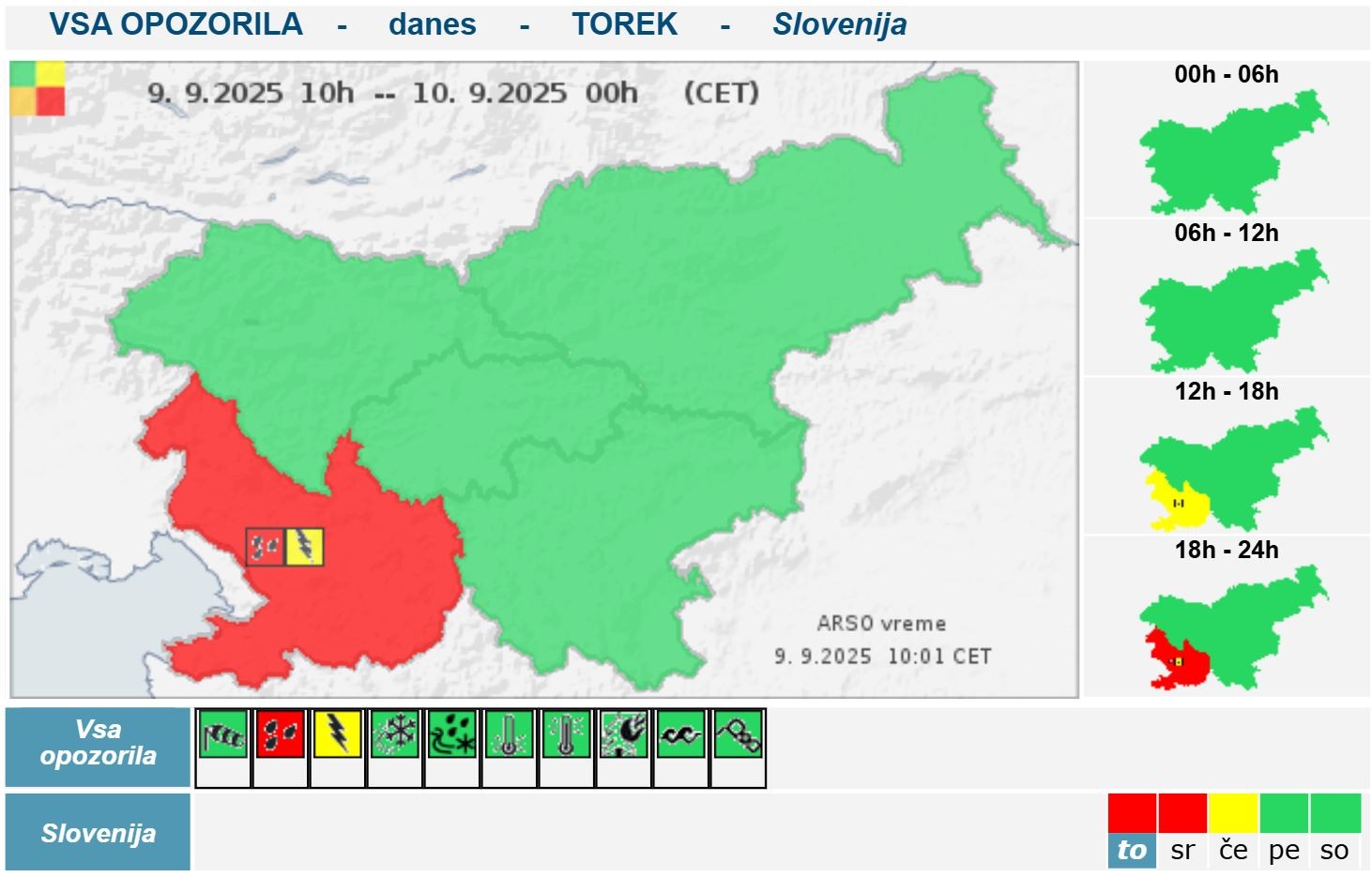 Po napovedih Arsa bodo od danes zvečer do noči na četrtek predvsem v zahodni ter deloma osrednji in južni Sloveniji pogosti močni in dolgotrajni krajevni nalivi. Zaradi napovedi velikih količin padavin so za jugozahod države izdali rdeče opozorilo.