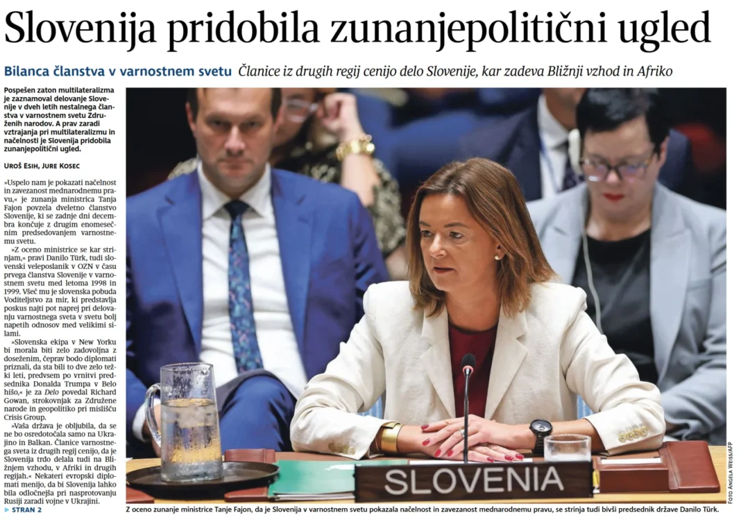 Ne verjamete? Se vam takšna ugotovitev zdi povsem neverjetna? Tudi nam, pa vendar, Delo je ugotovilo prav to. Slovenija se namreč po dveh letih poslavlja od statusa nestalne članice Varnostnega sveta Združenih narodov in v času tega mandata naj bi si pridobila simpatije nekaterih držav, še posebej zaradi osredotočenosti na dogajanje v Afriki in na Bližnjem vzhodu.