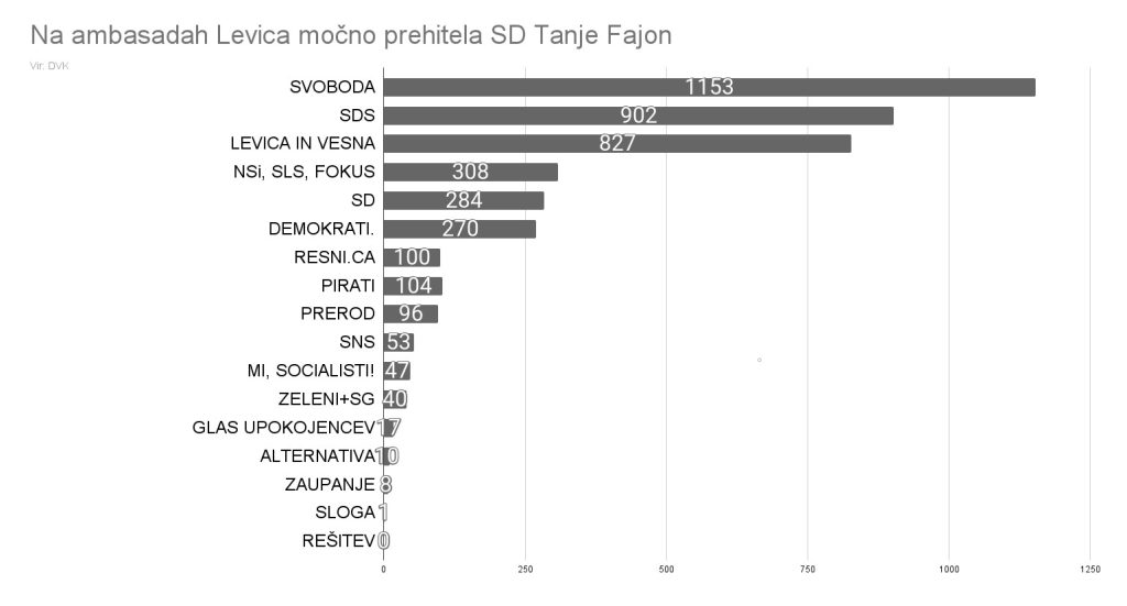 Čeprav ministrstvo za zunanje zadeve vodi Tanja Fajon (SD) in stranka velja za tisto, ki lahko zaradi tega ob Svobodi najbolj intenzivno kadrira v diplomatsko mrežo, se je to v volilnem izplenu bolj poznalo manjši Levici, ki je nastopila v koaliciji z Vesno. Ko gre za rezultate na vseh ambasadah (tudi manjših, kjer podrobnih rezultatov DVK ni predstavila) je Levica z Vesno s 827 glasov takoj za Svobodo s 1153 glasovi in SDS s 902 .