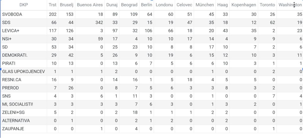 Podatke po ambasadah so v DVK dolgo preštevali, v preteklosti sem jih po zapisnikih iz volišč na diplomatsko konzularnih predstavništvih predstavil že nekaj dni po volitvah. Tokrat so bili podatki dostopni šele krepko več kot teden po volitvah. Podrobnejši pregled po ambasadah, kjer je bilo volivcev vsaj sto, kažejo, da je SDS zmagala v Buenos Airesu in Torontu, Svoboda v Bruslju in Beogradu, Levica v Berlinu in Londonu.