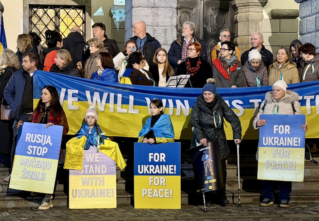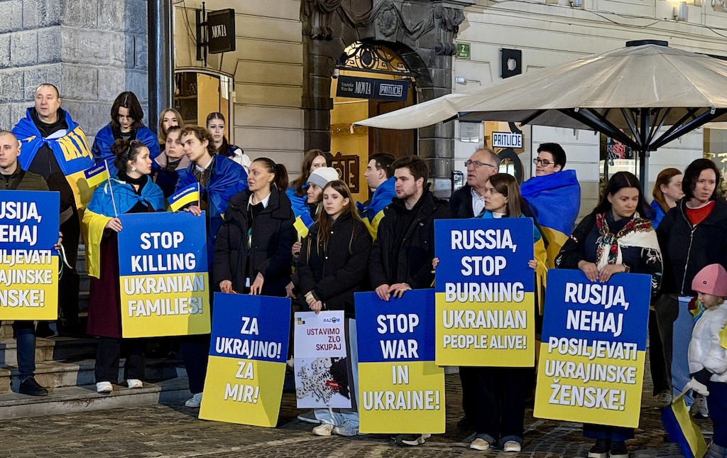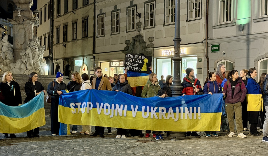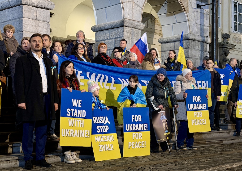 Včeraj, ob četrti obletnici ruske obsežne invazije na Ukrajino, se je ukrajinska skupnost v Sloveniji zbrala v Ljubljani, da bi Evropo spomnila: obstajamo, borimo se za svojo in vašo svobodo, imamo pravico do svojega mirnega doma in si prizadevamo za pravičen mir!