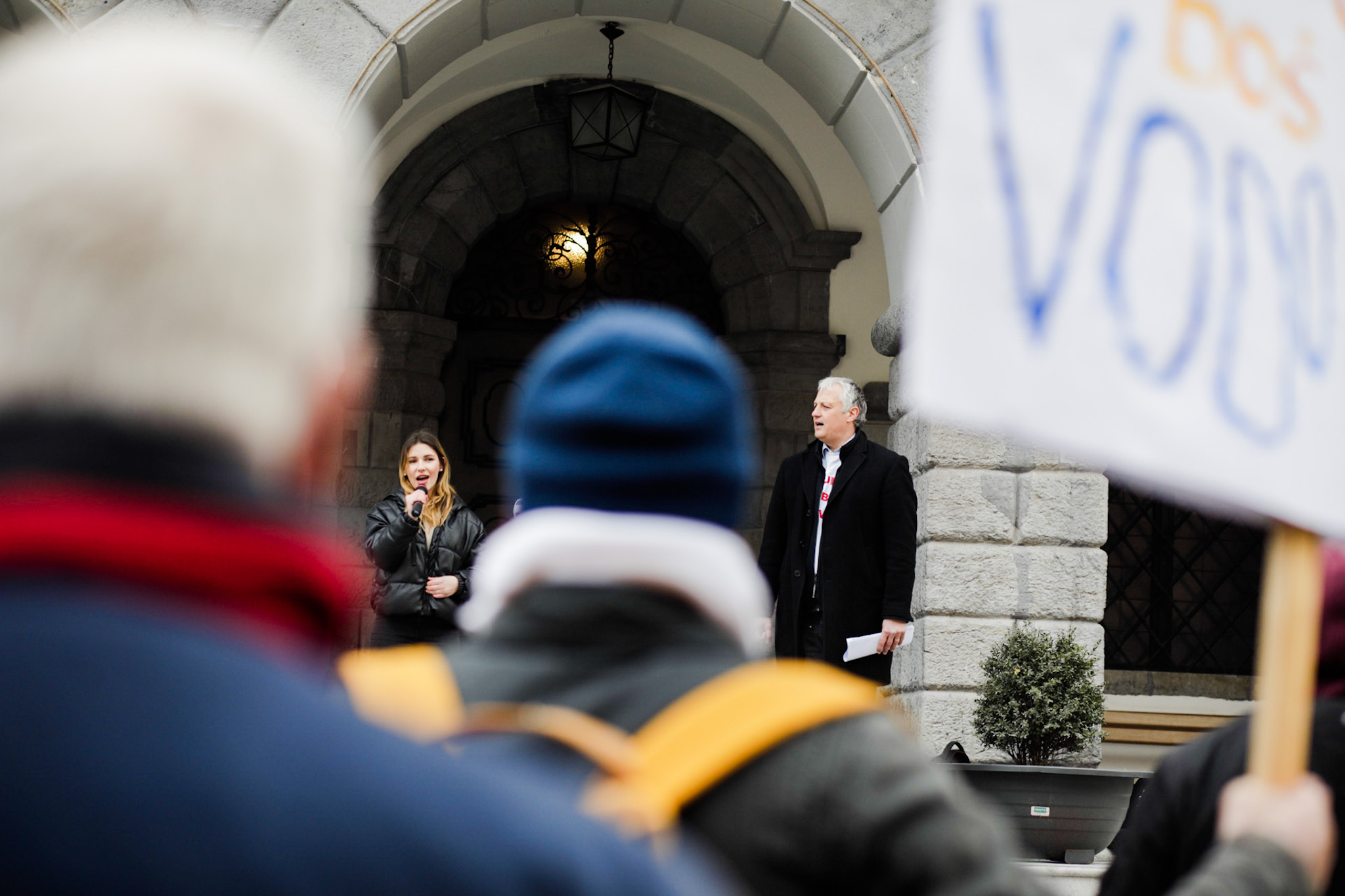 “Vsi, levi in desni potrebujemo čisto pitno vodo. Vsi potrebujemo zdravnika in tukaj je res priložnost, da se Ljubljana združi.” V primeru, da Janković protestnikov ne bo slišal pa je Primc odvrnil: “Sliši, brez skrbi, ima pisarno tu zgoraj.” Nadaljevati nameravajo, dokler Janković ne bo pripravljen na sodelovanje in pogovor. Pred vsako sejo mestnega sveta nameravajo sklicati protest, če bo potrebno. “Dokler v Ljubljani ne bo vzpostavljeno sodelovanje, bo protest pred vsako sejo mestnega sveta!” je odločen Primc. Naslednji protest bo 20. marca. V nadaljevanju je bilo slišati pesem “Samo milijon”. V znak, da potrebujemo vodo tako levi in desni, so predvajali tudi pesem “Hej, brigade!” Med pesmijo, se je kot papež na oknu nenadoma prikazal sam Janković. Zatem pa se je protest tudi uradno začel. Primc: “Drage prijateljice in prijatelji, dobrodošli v Beli Ljubljani!”