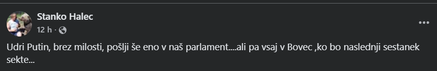 Levičar Stanko Halec nadaljuje z grožnjam sedaj kar vsem članom stranke SDS! Poziva ruskega predsednika, da vrže bombo na naslednji SDS-ov zbor? Slovenski državljani to ni več hec, je na družbeno omrežje X, zapisal Nikola Popovič in priložil zapis ekstremnega levičarja Stanka Haleca, ki poziva Ruse, naj vrže bombo v Bovec.