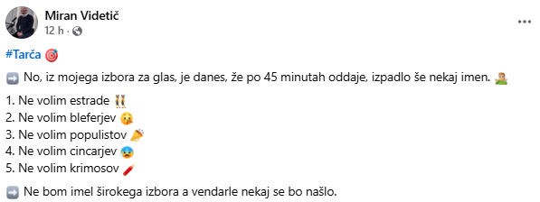 Kritičen je bil tudi politični analitik Miran Videtič, ki je na Facebook pa je zapisal: “No, iz mojega izbora za glas je danes, že po 45 minutah oddaje, izpadlo še nekaj imen. 1. Ne volim estrade, 2. Ne volim bleferjev, 3. Ne volim populistov, 4. Ne volim cincarjev, 5. Ne volim krimosov. Ne bom imel širokega izbora a vendarle nekaj se bo našlo.”