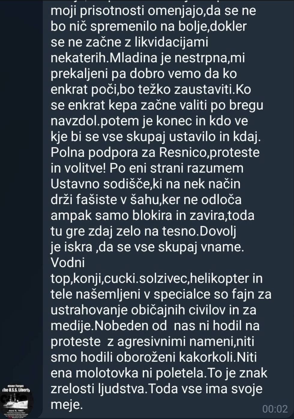 Da se ne bo nič spremenilo na bolje, dokler se ne začne z likvidacijami, pa na družabnih omrežjih pišejo tudi nekateri drugi privrženci teorij zarote. “Polna podpora za Resnico, proteste in volitve,” je zapisal uporabnik in dodal, da po eni strani razume ustavno sodišče, ki na nek način drži fašiste v šahu, ker ne odloča, ampak samo blokira in zavira, toda tu gre zdaj zelo na tesno. Zapisal je še, da nihče od njih do sedaj ni hodil na proteste z agresivnimi nameni, niti ena molotovka ni poletela. Toda vse ima svoje meje, je namignil – lahko torej naslednjič pričakujemo orožje in molotovke?