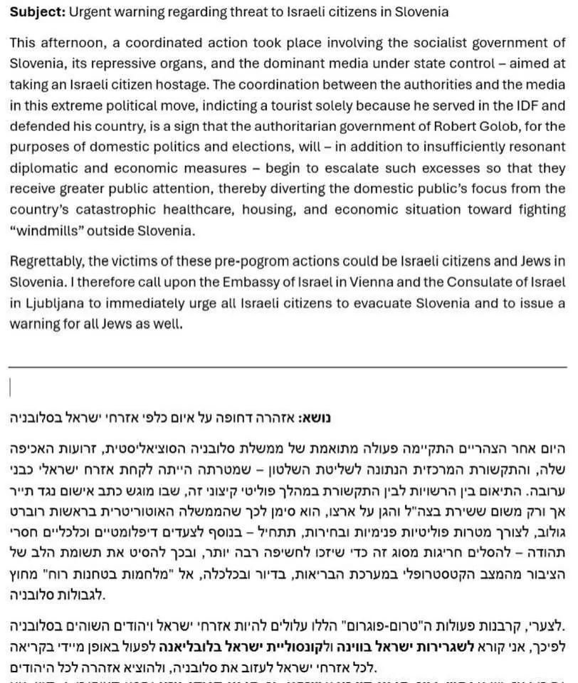 Izraelska ambasada na Dunaju in Izraelski konzulat v Ljubljani sta prejela urgentno opozorilo glede varnostnih groženj, ki jih lahko trenutno doživljajo izraelski državljani v Sloveniji. Opozorilo je bilo izdano v luči nedavne koordinirane akcije slovenske vlade, njenih represivnih organov in pod kontrolo države delujočih medijev, katerih cilj je bil politično pritiskati na izraelskega državljana znotraj slovenskega teritorija, pravi v opozorilu.