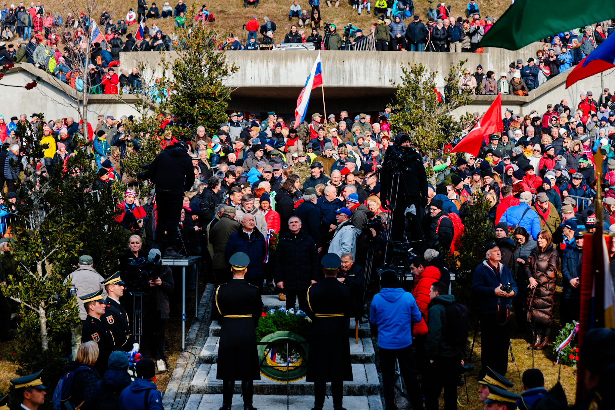 Med danes zbranimi v Dražgošah so bili predsednik državnega sveta Marko Lotrič in nekateri ministri ter poslanci SD, Levice in Gibanja svoboda. Kot vsako leto je v Dražgoše prišel tudi prvi slovenski predsednik Milan Kučan, garda Slovenske vojske pa je v imenu aktualne predsednice države Nataše Pirc Musar k spomeniku položila venec. Padlim so se med drugim poklonile tudi delegacije borčevskih združenj, nekaterih občin in političnih strank, poroča STA.