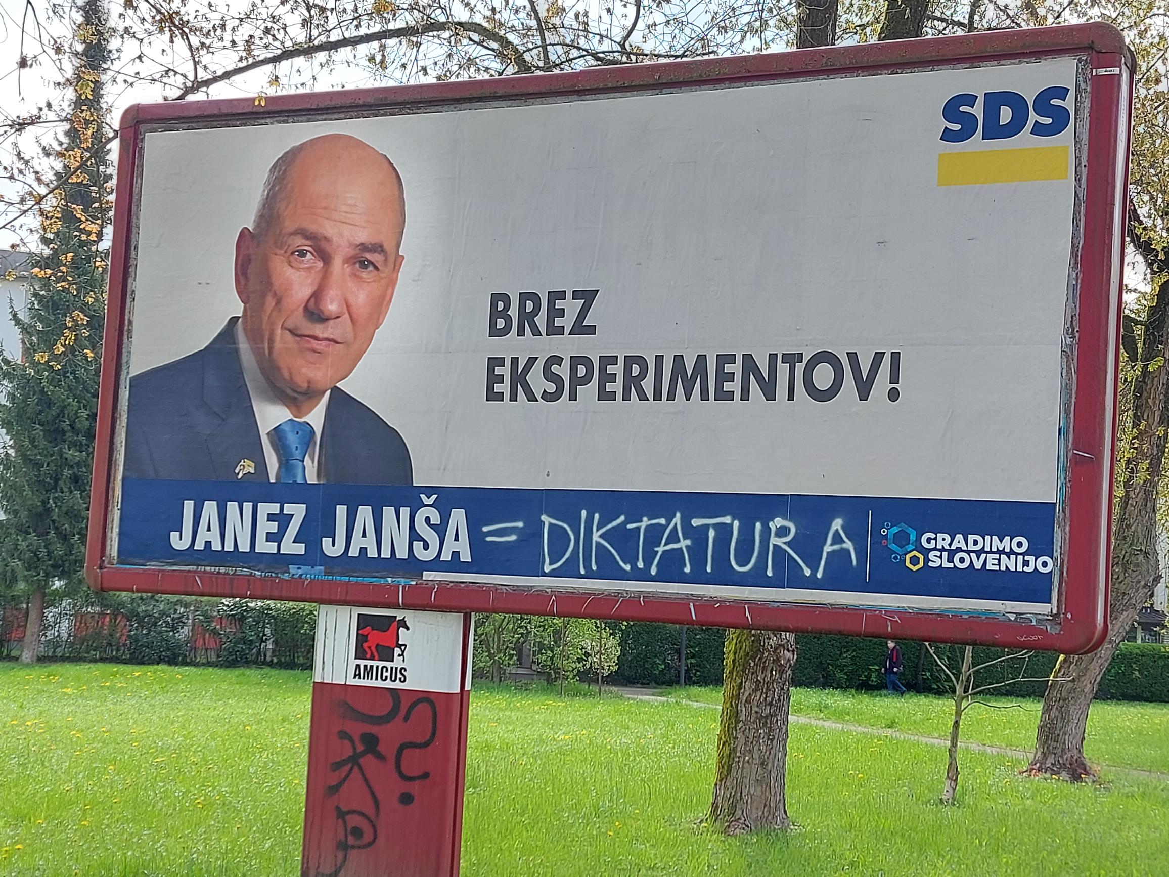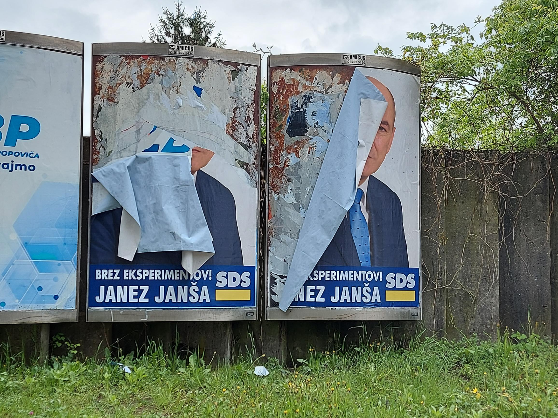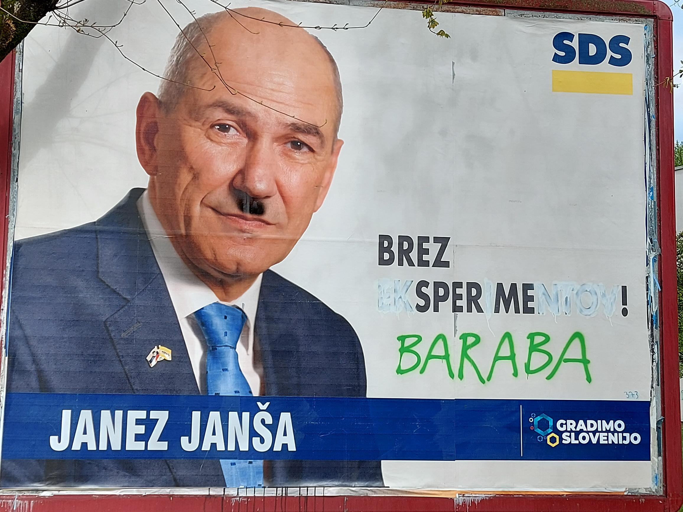 V noči s petka na soboto so bili v Šiški v Ljubljani očitno spet na delu mazači »civilne družbe«. Večina plakatov z logotipom SDS in portretom premierja Janeza Janše je popacana, porisana, popisana ali potrgana.