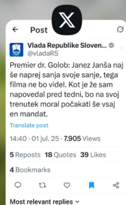 Politični kontekst: Sporočilo je treba razumeti v luči dolgotrajnega rivalstva med Golobovo Gibanjem Svoboda in Janševo Slovensko demokratsko stranko (SDS). Od Golobove zmage leta 2022, ko je njegova koalicija prevzela oblast po letih Janševega vpliva, je politična napetost visoka. Vendar pa uporaba uradnega vladnega profila za osebne politične poudarke presega običajno mejo, ki ločuje vladno vlogo od strankarske retorike.