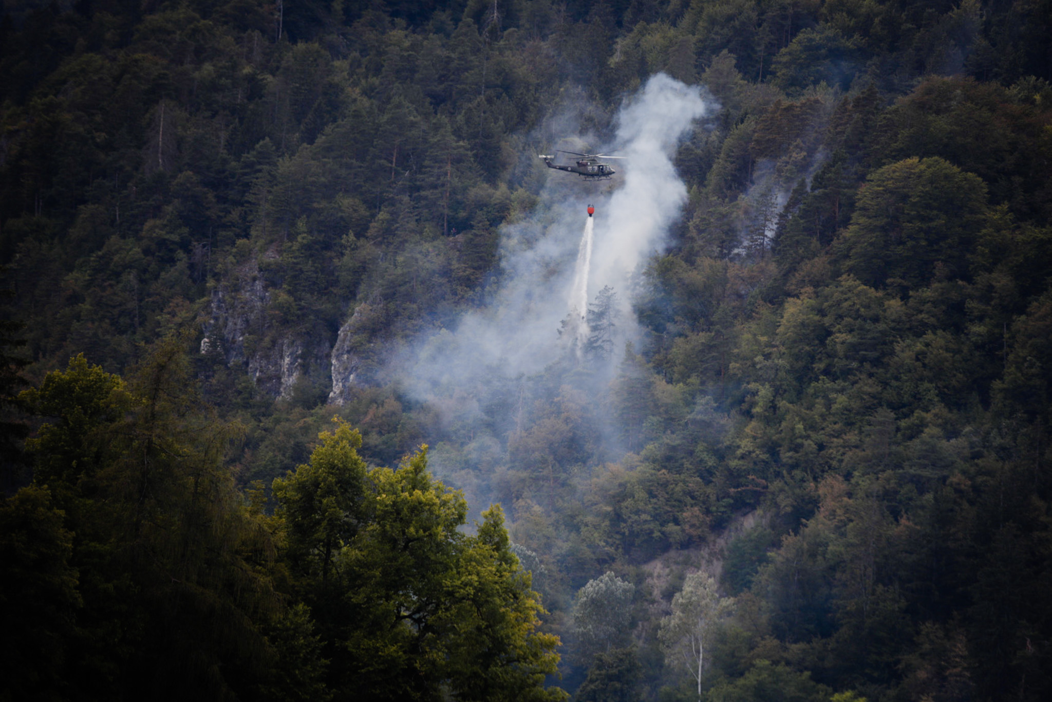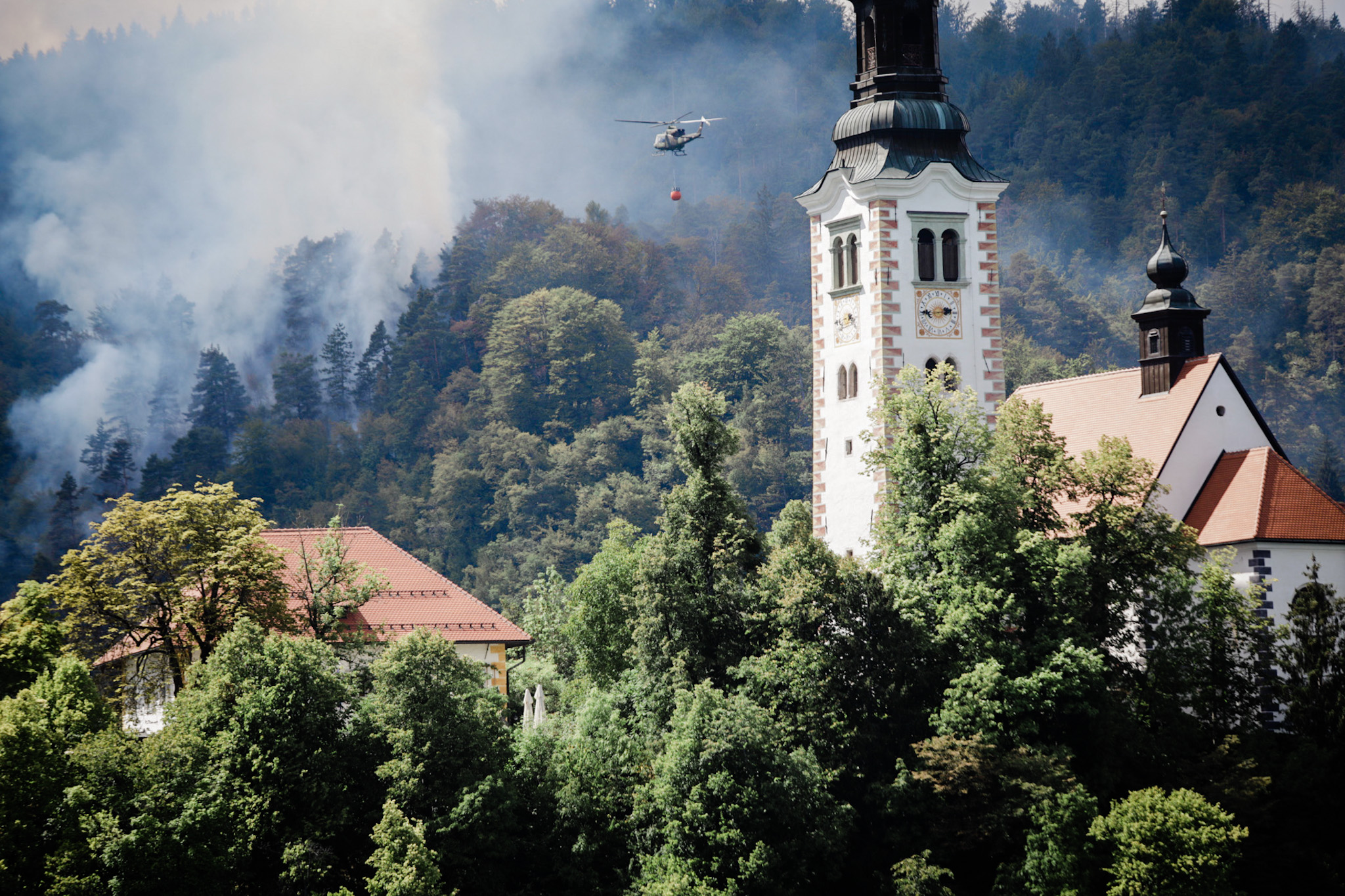“Ogenj trenutno gasijo gasilci in en vojaški helikopter, ki vodo zajema v Blejskem jezeru na predelu Njivice pri vili Jelovica. Pri železniski postaji sta  ustavljena cestni in železniški promet. Gori del gozda.”