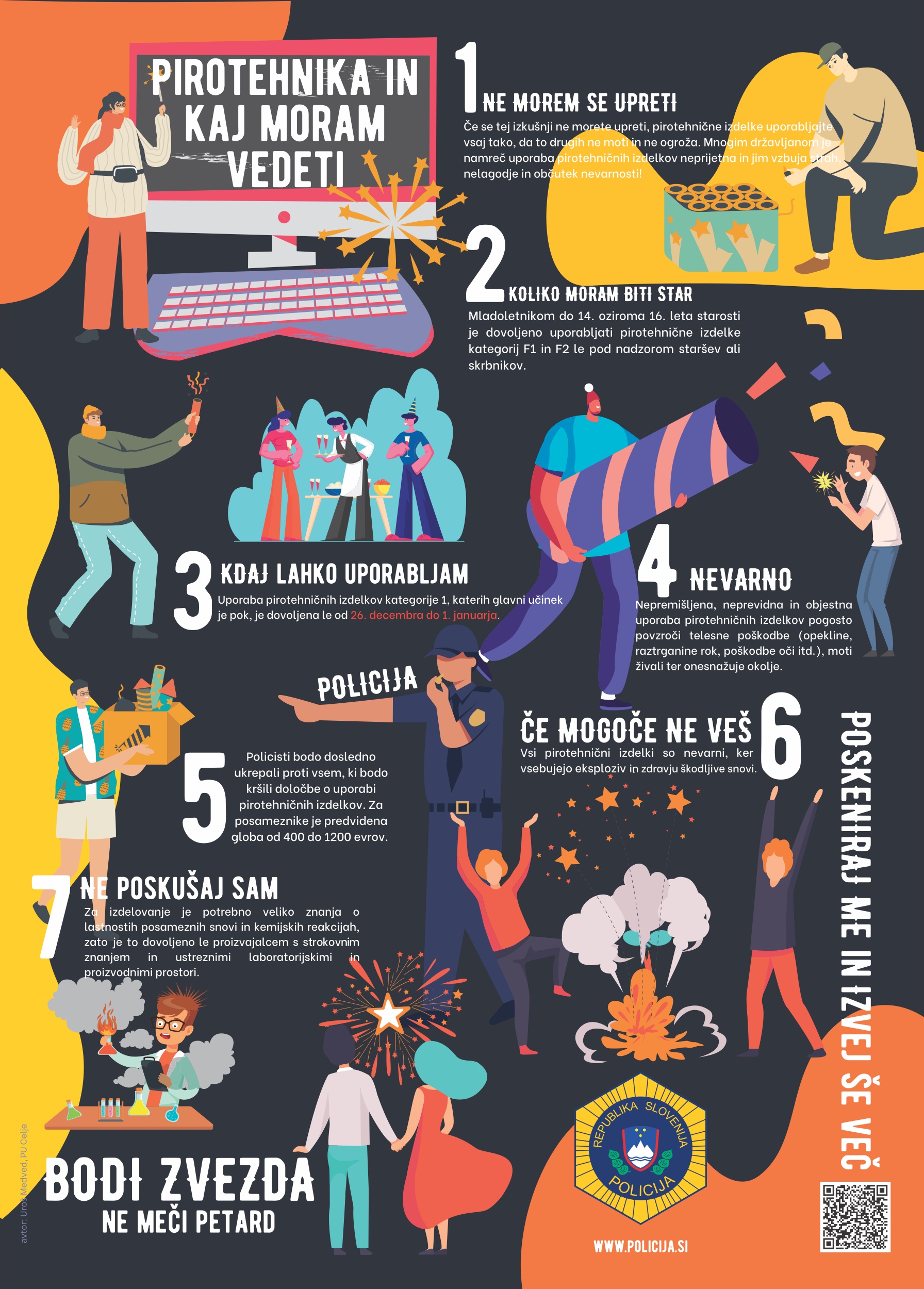 Če boste v omenjenem času kljub temu kupovali ali uporabljali ognjemetne izdelke kategorije F1 pa vas pozivamo, da z zgledom pripomorete k preprečevanju neželenih posledic. Pirotehniko uporabljajte v skladu z navodili proizvajalca, uporaba pa naj bi čim manj moteča za okolico. Pomembno vlogo imate tudi starši, ki s svojim obnašanjem in odnosom do pirotehničnih izdelkov vplivate na zavest in obnašanje otrok. Naj trenutek užitka ne pusti nepopravljivih, bolečih ali celo usodnih posledic za celo življenje (več o aktivnostih policije in drugih ustanov za varnejše praznike tudi na naslednjih spletnih straneh Policije: https://www.policija.si/medijsko-sredisce/sporocila-za-javnost/sporocila-za-javnost-gpue/120491-veseli-december-in-pirotehnika-praznicno-vzdusje-si-lahko-pricarate-tudi-brez-nevarnega-in-nadleznega-pokanjaTudi na območju PU Nova Gorica je pri uporabi pirotehničnih izdelkov v prejšnjih letih prihajalo do telesnih poškodb, kršitev javnega reda in miru ter do materialne škode in pritožb in klicev občanov nad pretirano, nehumano ali objestno uporabo petard. Nepremišljena, neprevidna in objestna uporaba pirotehničnih izdelkov namreč pogosto povzroči telesne poškodbe (opekline, raztrganine rok, poškodbe oči itd.), moti živali (mnoge namreč preživljajo hud stres, še posebej ob objestni uporabi in dejstvu, da se nimajo kam umakniti), onesnažuje okolje ter povzroči materialno škodo.Na območju Policijske uprave Nova Gorica smo v lanskem božično-novoletnem v času oz. od 1. decembra 2022 do 10. januarja 2023 obravnavali 8 kršitev v zvezi z nedovoljeno uporabo pirotehničnih izdelkov oz. kršitev določil Zakona o eksplozivih in pirotehničnih izdelkih, večina kršiteljev (6) so bile mladoletne osebe. Zoper dva mladoletnika je bil zaradi kršitve določb ZEPI-A podana kazenska ovadba na pristojno sodišče, zoper dva otroka pa je bilo obveščeno pristojni CSD Severna Primorska; vsi dogodki so bili obravnavani na območju PP Nova Gorica. V navedenem času so policisti PU Nova Gorica zasegli skupno 555 pirotehničnih izdelkov. Zaradi nepravilne uporabe pirotehničnih sredstev v lanskem prednovoletnem obdobju je bila ena (polnoletna) oseba telesno poškodovana.