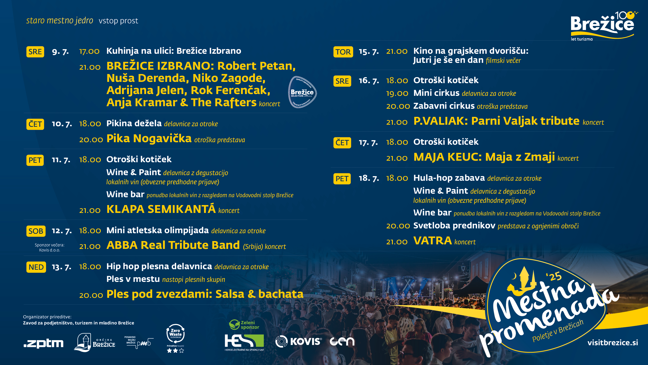 Mestna promenada Brežice bo tudi letos stičišče dogajanja za vse okuse. Prireditev je bila že leta 2024 s strani globalne organizacije Green Destinations uvrščena med Top 100 zgodb na svetu, kot primer dobre prakse na področju trajnostnega turizma. Tudi letos si organizatorji prizadevajo ohranjati visoke okoljske standarde in spodbujati obiskovalce k odgovornemu in trajnostnemu ravnanju na prireditvah. Da bo druženje v starem mestnem jedru še bolj prijetno, pa bo letos poskrbel zeleni sponzor prireditve, HESS d.o.o. Vse aktivnosti na Mestni promenadi (z izjemo delavnice Wine & Paint, 25,00 € na osebo) so brezplačne.