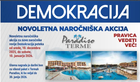 Vabljeni k božično-novoletni akciji za nove naročnike. Z naročilom na tednik Demokracija boste imeli vsak teden na voljo kvalitetne in aktualne članke o slovenski politiki ter družbi. Novoletna naročniška akcija za nove naročnike revije Demokracija poteka od srede, 10. decembra 2025, do ponedeljka, 10. januarja 2026.