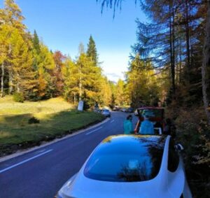 Vršič pa bo deležen eksperimenta omejevanja prometa in ravno je potekal 14-dnevni preizkus delovanja zapornic oziroma novega prometnega režima na vršiški cesti. Sredi dneva sem v Kranjski gori naključno na spletu prebral: »Ne hodite na Vršič, ker je neprevozen!«, »Prava norišnica!« in podobna opozorila, zato sem se proti domu, čez Vršič odpravil brez naglice in ob 14.24 uri, sem pravilno na desni zapornici pri Jasni, prevzel listek za parkiranje, saj sem se nameraval ustaviti na prelazu in preveriti, kaj se dogaja. Že od Mihovega doma naprej so bila izven cestišča pravilno parkirana številna vozila in tako je bilo povsod, kjer je bilo mogoče. Vsa parkirišča so bila nabito polna, saj je prekrasno vreme na Vršič privabilo veliko ljudi, ki so se pripeljali s svojimi vozili.