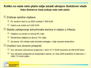 Vlada Roberta Goloba je v eni prvih svojih potez razveljavila razbremenilne spremembe dohodnine prejšnje vlade, vsem naložila obvezen nov zdravstveni prispevek in lani še prispevek za dolgotrajno oskrbo, ki jo plačujemo že več kot pol leta, čeprav še vedno skoraj ne deluje. Zaradi tega imamo vsi bistveno nižje neto plače, kot bi jih imeli brez Golobovih ukrepov.