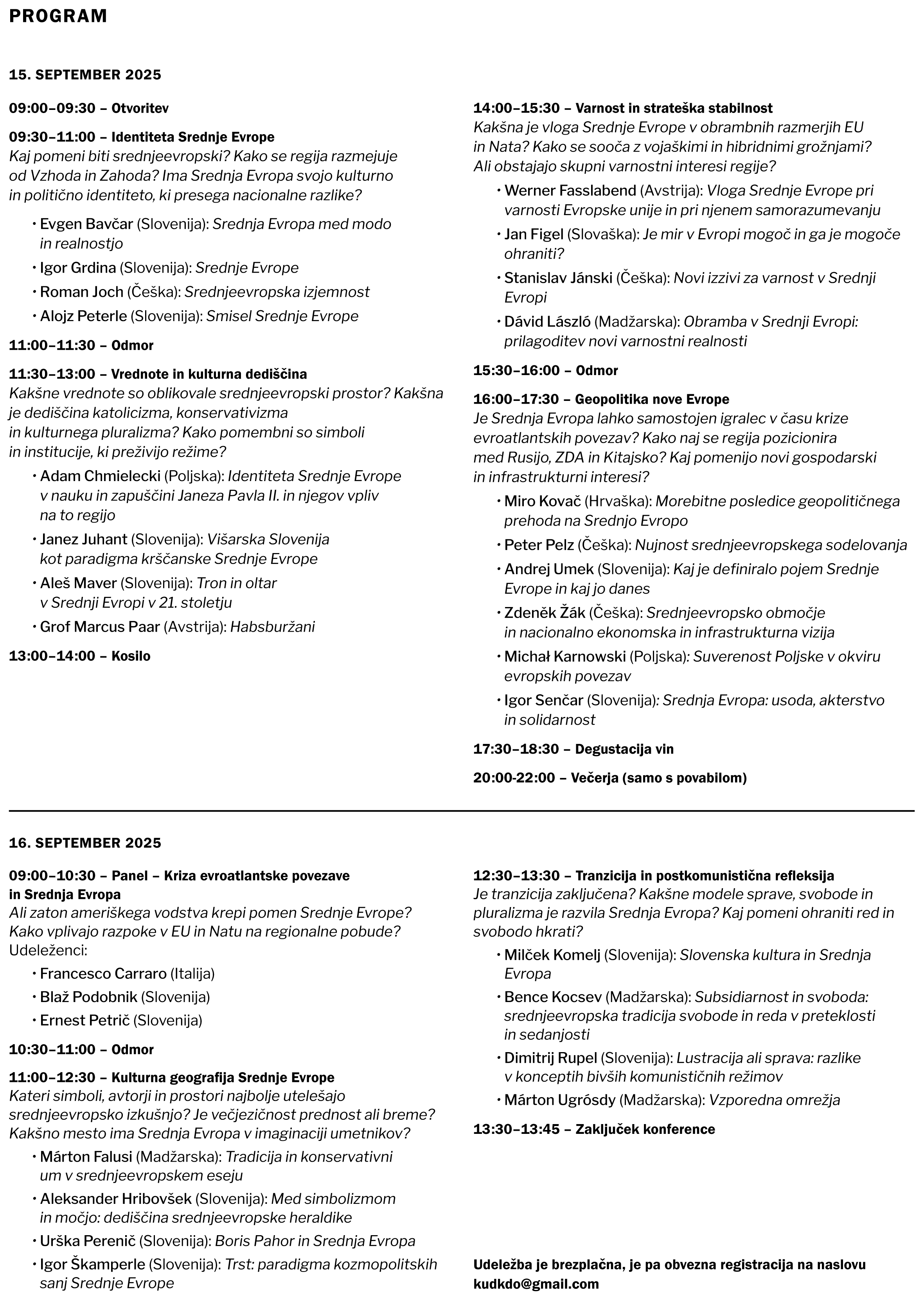 Konferenca bo združila priznane mislece, politologe, filozofe in kulturnike iz Slovenije ter širše regije. Osrednje teme bodo identiteta Srednje Evrope, vrednote in kulturna dediščina, varnost ter geopolitične perspektive regije v času spreminjajočih se mednarodnih odnosov.