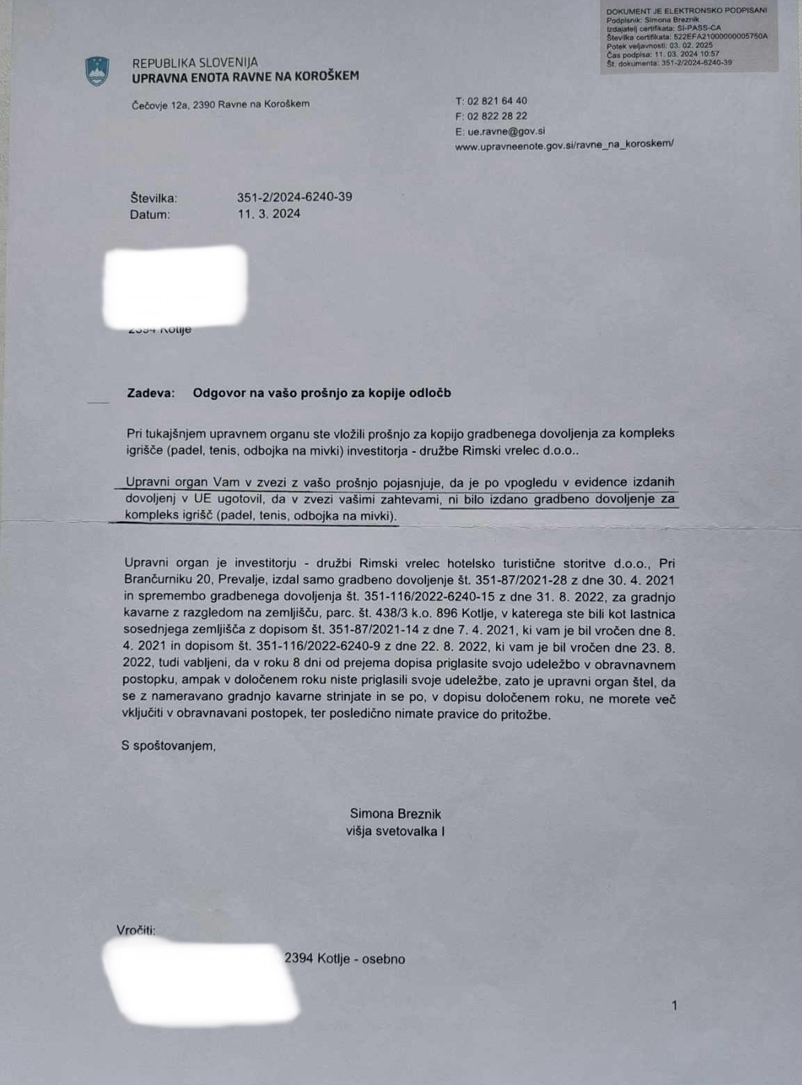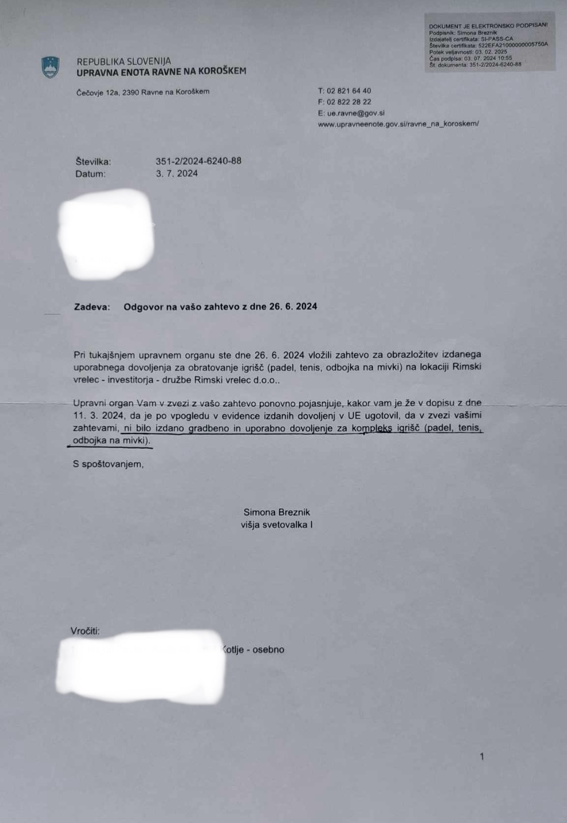 Ravne na Koroškem, avgust 2024 – Odprtje novega športno-rekreacijskega centra pri Rimskem vrelec že od samega začetka spremljajo resna vprašanja o zakonitosti delovanja. Kljub uradnim dokumentom, ki jih je izdala Upravna enota Ravne na Koroškem in ki jasno potrjujejo, da “Športno rekreacijski kompleks” deluje brez potrebnih gradbenih in uporabnih dovoljenj, inšpekcijske službe že deset mesecev zavračajo ukrepanje. Podjetje v lasti Dervodela brezsramno trži kompleks, zgrajen na črno, ne da bi se zmenilo za pravila.