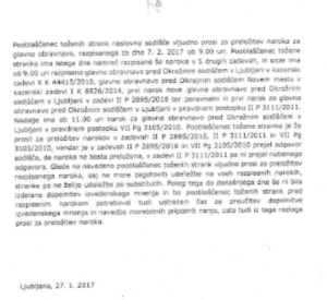Po vpogledu v sodni spis je tožnica našla dopis pooblaščenke tožene stranke. V dopisu, ki ga je datirala z dnem 27.1.2017 (torej kar 50 dni po soglasni določitvi datuma za glavno obravnavo) pooblaščenka Darja Kralj navaja, da naj bi imela dne 7.2.2017, poleg obravnave v tej zadevi II P 609/2015, kar 5 (z besedo pet) drugih obravnav, od tega kar 4 (z besedo štiri) ob isti uri in sicer: ob 9. uri glavno obravnavo pred Okrožnim sodiščem v Ljubljani v kazenski zadevi X K 44415/2010; glavno obravnavo pred Okrožnim sodiščem v Novem mestu v kazenski zadevi I K 8826/2014; prvi narok nove glavne obravnave pred Okrožnim sodiščem v Ljubljani v zadevi II P 2895/2016 ter prvi narok za glavno obravnavo pred Okrožnim sodiščem v Ljubljani v pravdnem postopku II P 3111/2011. Nadalje naj bi pooblaščenka ob 11. uri imela še narok za glavno obravnavo v pravdnem postopku VII Pg 3105/2010 pred Okrožnim sodiščem v Ljubljani.
