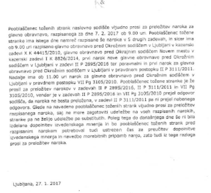 Pooblaščenka je tako na primer po drugi strani kot razlog za potrebo preložitve naroka dne 7.2.2017 navedla nujnost prisotnosti zaradi, po njenih zatrjevanjih, istočasne prisotnosti na obravnavi pred Okrajnim sodiščem v Novem mestu v kazenski zadevi I K 8826/2014 ob 9. uri. Pri tem je vztrajno zavajala tožeče stranke in celo zatrjevala, da je sodišče ugodilo njeni »utemeljeni« prošnji. Pri tem pa se je povsem izognila obrazložitvi svoje temeljne navedbe v prošnji za preložitev naroka z dne 27.1.2017, da »ne more zagotoviti udeležbe na vseh razpisanih narokih, stranke pa ne želijo udeležbe po substitutih«, kot je razvidno is spodnje prošnje pooblaščenke za preložitev naroka, datirane z dnem 27.1.2017. Pri tem se seveda postavlja vprašanje: Substitutih koga? Katerega odvetnika?