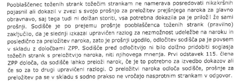 V petek, dne 3.2.2017 popoldan, torej le slabe štiri dni pred napovedano obravnavo (vmes sta bili še sobota in nedelja), je sodišče tožeči stranki posredovalo obvestilo o preklicu naroka, ki je bil nato preložen na 16.3.2017. Kot obrazložitev je bilo navedeno zgolj, da se narok prekliče zaradi prošnje pooblaščenke tožene stranke, to je Darje Kralj. Ne samo, da se je zaradi tega postopek ponovno zavlekel, temveč je tožeči stranki zaradi tega propadel še dopust, saj ga seveda en dan pred tem (v ponedeljek 6.3.2017) ni mogla enostavno preklicati.