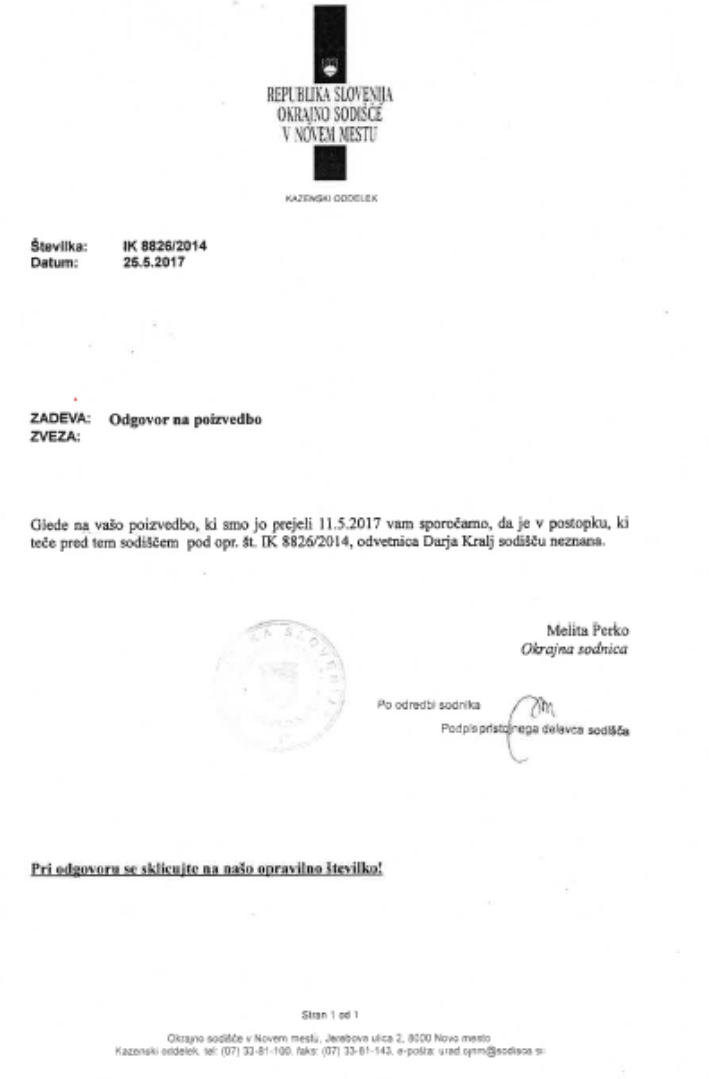 Glede na tovrstno aroganco, tožnici ni preostalo drugega, kot da sama preveri resničnost trditev Darje Kralj neposredno na pristojnih sodiščih. Okrajno sodišče v Novem Mestu je nato ugotovilo in potrdilo, da je odvetnica Darja Kralj (to je pooblaščenka toženih strank) v zvezi s kazensko zadevo, na katero se je v svojem opravičilu sklicevala, sodišču neznana in jo s tem postavilo na laž. Ostala sodišča pa se s temi njenimi mešetarjenji sploh niso želela ukvarjati.