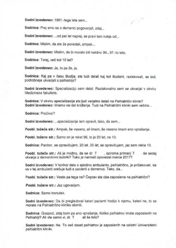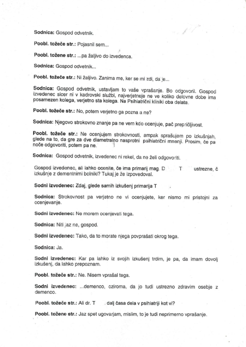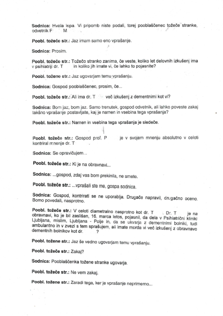 Res pa je, da je bil v sklopu tožničine tožbe angažiran tudi izvedenec psihiatrične stroke, ki je nedvomno ugotovil, da je bila oseba, ki je podpisovala nične pogodbe v korist tožene stranke, dementna, oziroma nerazsodna. To odkritje očitno ni bilo po godu toženi stranki in njeni pooblaščenki in je nato pooblaščenka Kraljeva visoko usposobljenega izvedenca, sicer primarija in doktorja psihiatrične stroke večkrat žalila, da je nestrokoven, čeprav sama ni nikdar pojasnila, kakšna usposabljanja iz področja psihiatrije je sama zaključila. V svojih vlogah pa je navedla še bolj žaljive trditve, da naj bi na izvedenčevo subjektivno oceno vplivale njegove osebne travme in nesporazumi s starši in bližjimi sorodniki.