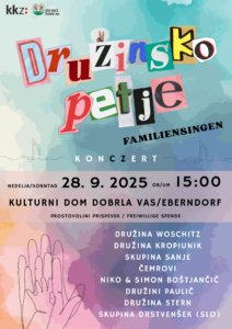 V nedeljo, 28. septembra, ob 15.00 bo v kulturnem domu v Dobrli vasi DRUŽINSKO PETJE, koncert, na katerem bodo nastopili skupina Sanje, družina Woschitz, družina Kropiunik, Čemrovi, družina Stern, skupina Drstvenšek (SLO), družina Milena in Franci Paulič, družina Barbi in Lenart Paulič, Simon in Niko Boštjančič. Organizatorji prisrčno vabijo k poslušanju!