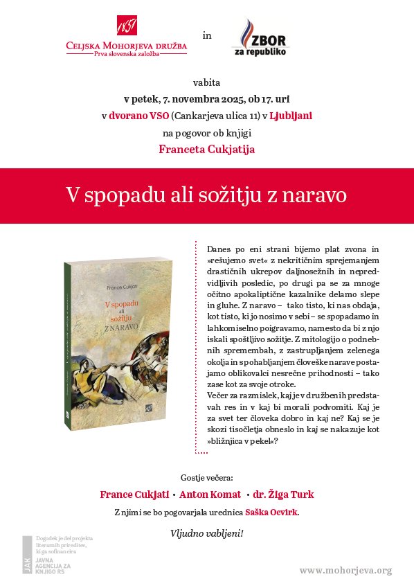 (VABILO) Pogovorni večer s Francetom Cukjatijem ob izidu njegove knjige Prejeli smoSlovenija 4. novembra, 2025 Share FacebookTwitter France Cukjati, inženir, teolog, zdravnik, nekdanji poslanec in nekaj let tudi predsednik Zbora za republiko. (foto: Polona Avanzo) Združenje za VSO vas v sodelovanju s Celjsko Mohorjevo družbo in Zborom za republiko vabi na POGOVORNI VEČER Z GOSTOM FRANCETOM CUKAJTIJEM ki bo v petek, 7. novembra 2025, ob 17. uri v prostorih Muzejske zbirke VSO, Cankarjeva 11, Ljubljana. Gostje večera: France Cukjati, Anton Komat in dr. Žiga Turk Z njimi se bo pogovarjala: Saška Ocvirk Share FacebookTwitter PODPRITE DEMOKRACIJO!Drage bralke, dragi bralci, donirajte Demokraciji in podprite pluralnost slovenskega medijskega prostora! Donacija TagsFrance Cukjati Please enable JavaScript to view the comments powered by Disqus. Fokus Melania Trump prižgala luči na božičnem drevesu v Washingtonu Petra Janša - 5. decembra, 2025 Fokus V Velenju kipu Tita – simbolu zločina in komunistične diktature odstranili glavo Petra Janša - 5. decembra, 2025 Fokus Med otroke prihaja sveti Miklavž, še več krajev bo zasijalo v praznični razsvetljavi Petra Janša - 5. decembra, 2025 Izjava dneva Urška Bačovnik Janša: Zato je težko gledati trg, poln transparentov, ki pozivajo k smrti politika, igrajo nogomet z njegovo glavo in obešajo njegovo lutko... Petra Janša - 5. decembra, 2025 Sorodne vsebine Fokus Med otroke prihaja sveti Miklavž, še več krajev bo zasijalo v praznični razsvetljavi 5. decembra, 2025 Prejeli smo (PREJELI SMO) Združenje zasebnih vrtcev Slovenije: Ni denarja za zimski regres v zasebnih vrtcih s koncesijo 4. decembra, 2025 Fokus Sprenevedanje Tine Gaber Golob: najprej je SDS obtoževala manipulacij, sedaj za medijski zakon krivi koalicijske partnerje 3. decembra, 2025 Kultura Kultura, ki nas združuje: Slavje Prešerna in ustvarjalnosti 3. decembra, 2025