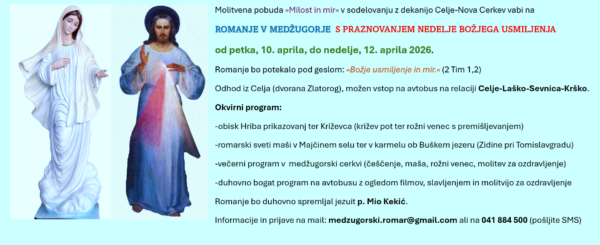 Piše: C. R. Vabljeni na romanje v Medžugorje v velikonočni osmini, s praznovanjem nedelje božjega usmiljenja. Romanje organizira molitvena pobuda “Milost in mir” v sodelovanju z dekanijo Celje-Nova Cerkev (in z blagoslovom škofa Maksimilijana) ob dvajsetletnici ustanovitvi celjske škofije ter ob 800-letnici smrti sv. Frančiška Asiškega (možnost prejema popolnega odpustka na romanju). Tako kot učenca, ki sta romala v Emavs in doživela srečanje … Nadaljujte z branjem (VABILO) Romanje v Medžugorje ob praznovanju nedelje božjega usmiljenja